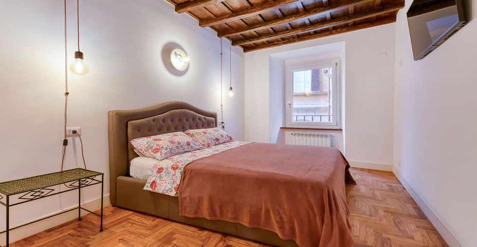 The Spanish Steps Apartment is a prestigious 140 m² residence located on the first floor of a historic building on Via D’Ascanio. The apartment sits on the first floor of one of Rome’s most elegant streets, just a few steps from Piazza Navona, the Pantheon, and Campo de’ Fiori, placing guests in the very heart of the Eternal City. Its interiors blend modern comfort with classic Roman charm, featuring exposed wooden ceilings, parquet floors, and carefully curated furnishings that create a sophisticated yet welcoming atmosphere.